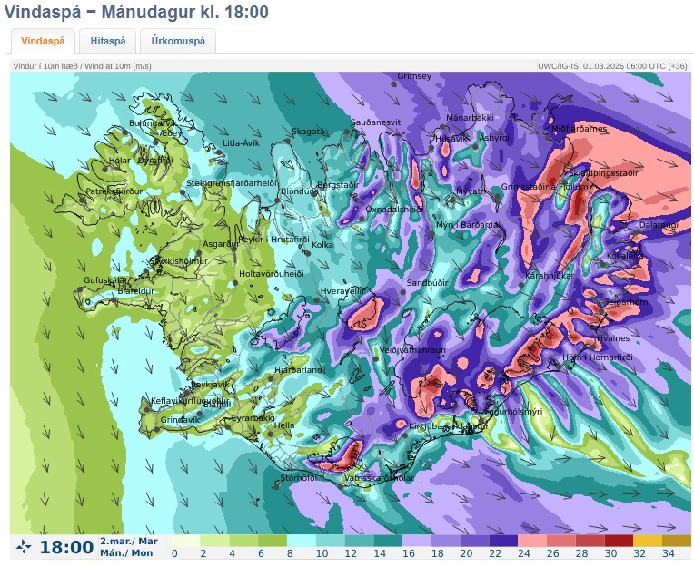 Á þriðjudag er svo útlit fyrir ákveðna suðaustanátt með snjókomu, og síðar slyddu eða rigningu, sunnan- og vestantil á landinu. Spá gerð: 01.03.2026 06:45. Gildir til: 02.03.2026 00:00.