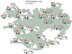 Hiti 8 til 16 stig, mildast á Suðvesturlandi.