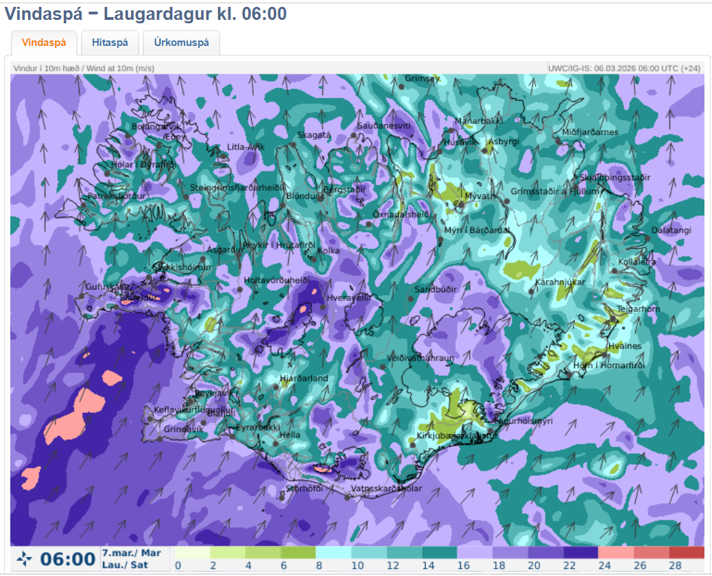 Á sunnudag er síðan útlit fyrir mun skaplegra veður, mun hægari vindur og bjartviðri austanlands, en fremur úrkomusamt sunnan- og vestantil. Spá gerð: 06.03.2026 06:31. Gildir til: 07.03.2026 00:00.