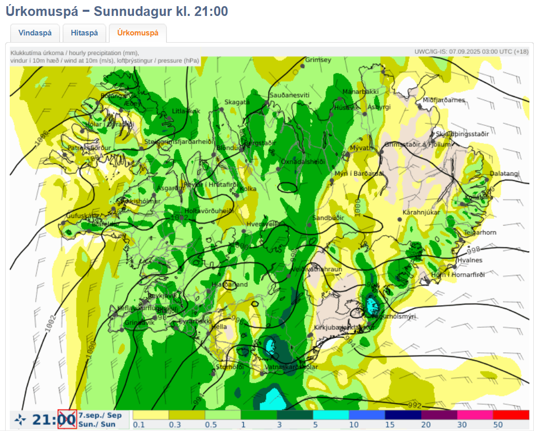 Seint á morgun er svo von á nýrri úrkomu gusu og tekur hún land á svipuðum slóðum og þær fyrri, eða á Suðausturlandi. Viðbúið er að vatn fari að safnast saman við svona mikla úrkomu á svipuðum slóðum og má því búast við miklum vatnavöxtum um landið suðaustanvert. Spá gerð: 07.09.2025 06:40. Gildir til: 08.09.2025 00:00.