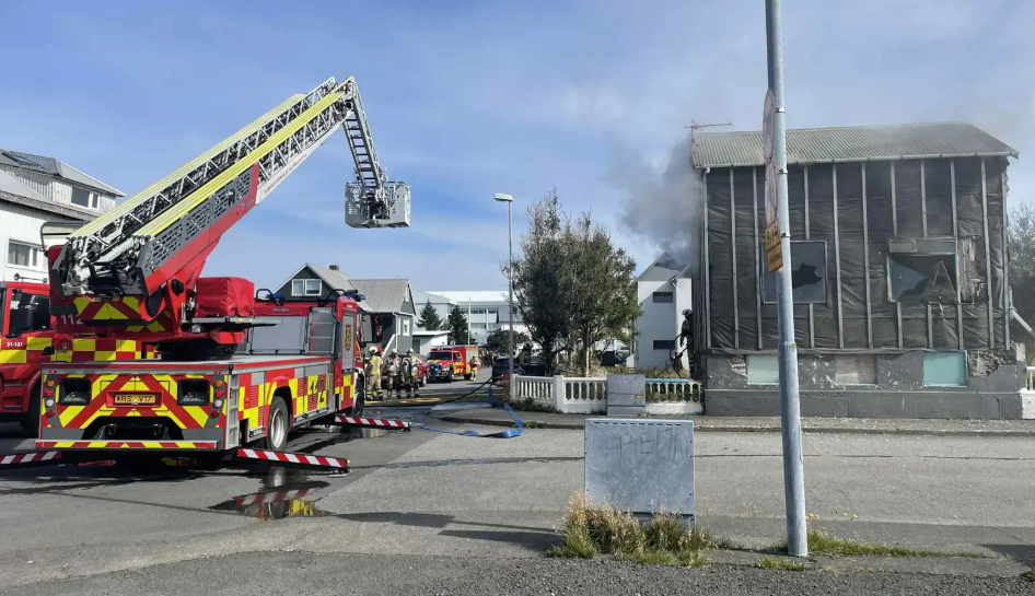 Eldur kviknaði í húsi á horni Heiðargerðis og Akurgerðis í miðbæ Akraness í dag. Mikinn og þykkan reyk leggur frá húsinu en það hefur verið án klæðningar í nokkurn tíma.