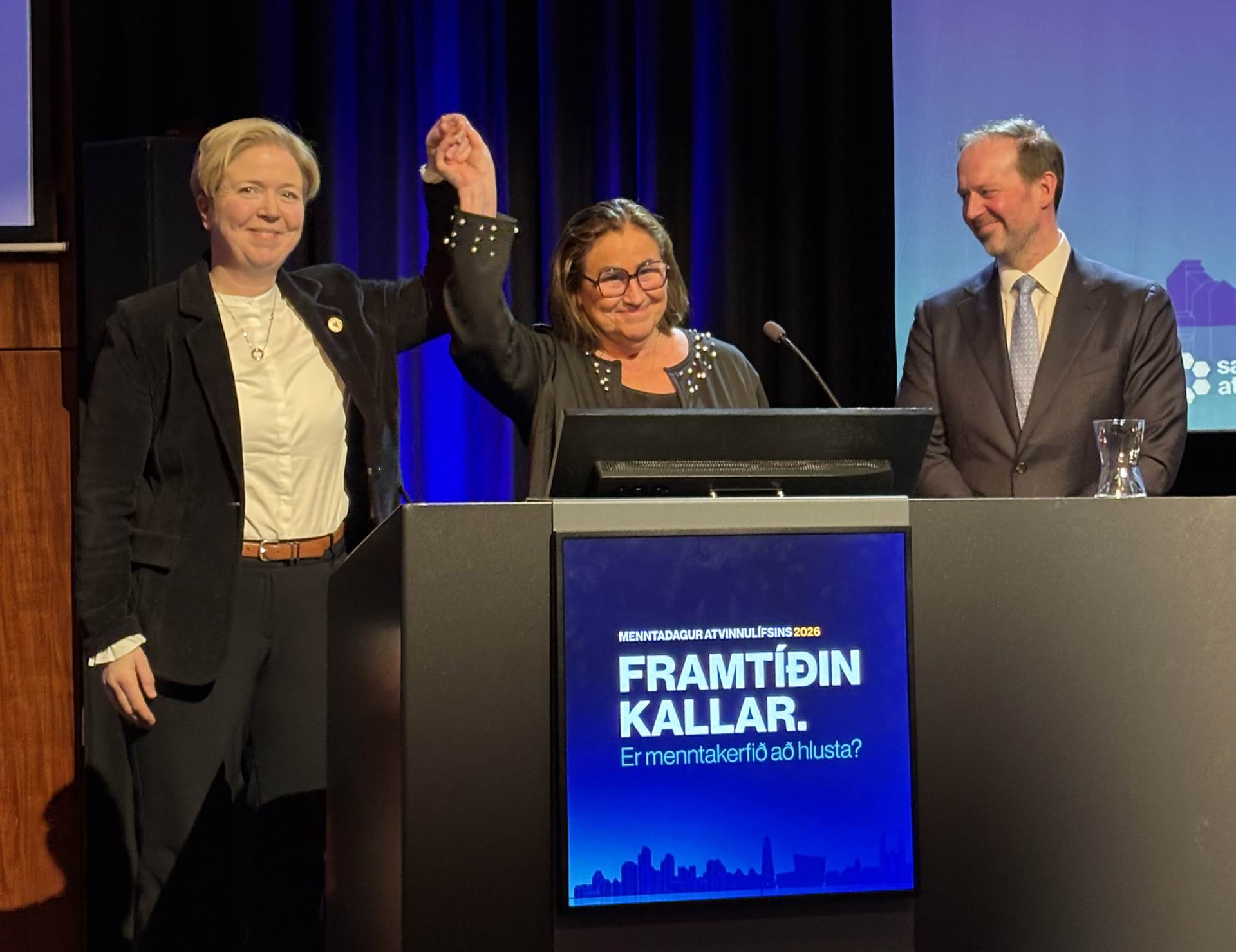 Dagskráin tók óvæntan snúning þegar Inga Sæland, mennta- og barnamálaráðherra, kallaði Hildi Ingvarsdóttur skólameistara Tækniskólans á svið til undirritunar samkomulags á Menntadegi atvinnulífsins. Ásamt Sigurði Hannessyni, framkvæmdastjóra Samtaka iðnaðarins.
