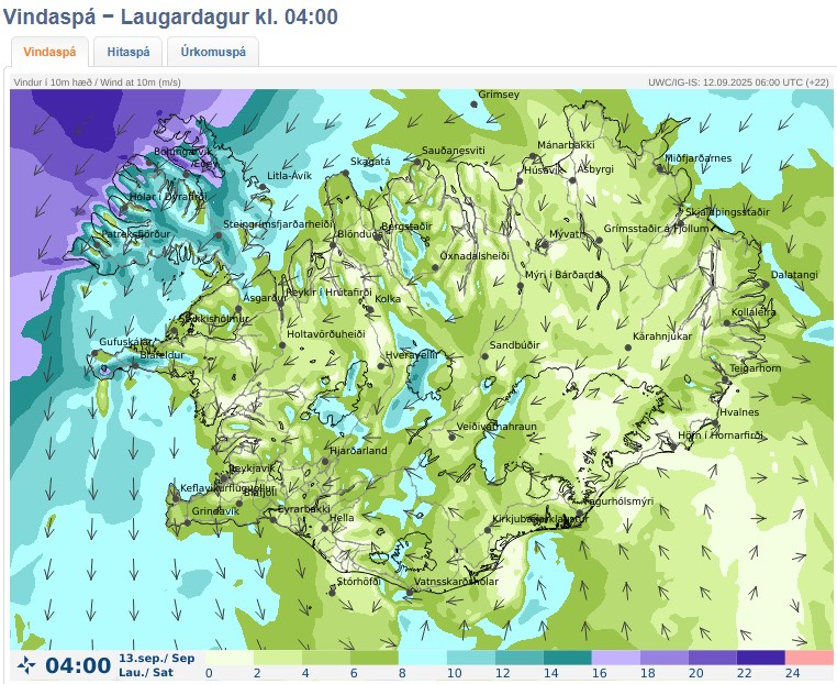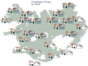 Norðaustlæg átt á morgun, 8-15 en hægari fyrir austan. Víða rigning eða skúrir. Hiti 7 til 14 stig, en heldur svalara á Vestfjörðum. Spá gerð: 12.09.2025 06:14. Gildir til: 13.09.2025 00:00.