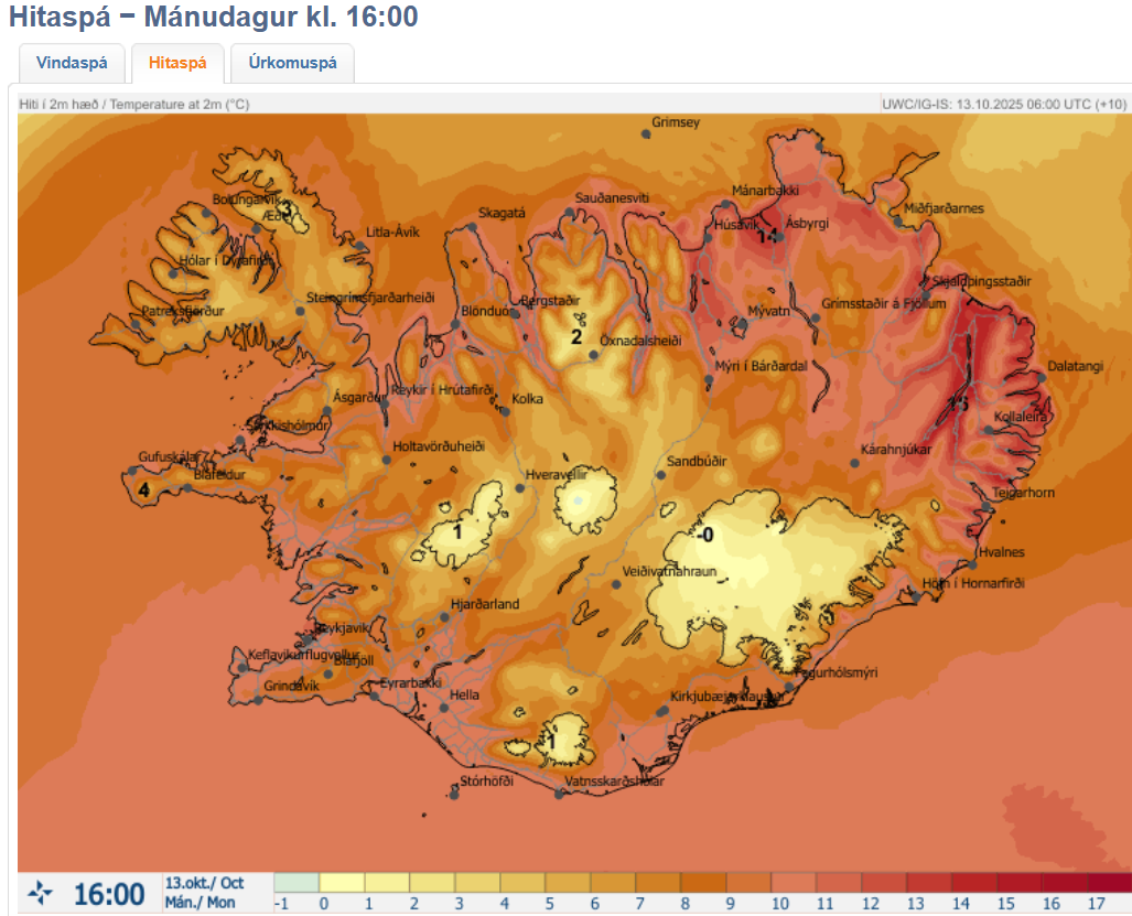 Spá gerð: 13.10.2025 08:21. Gildir til: 20.10.2025 12:00.