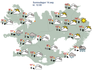 Hiti 8 til 15 stig. Spá gerð: 14.09.2025 06:30. Gildir til: 15.09.2025 00:00.