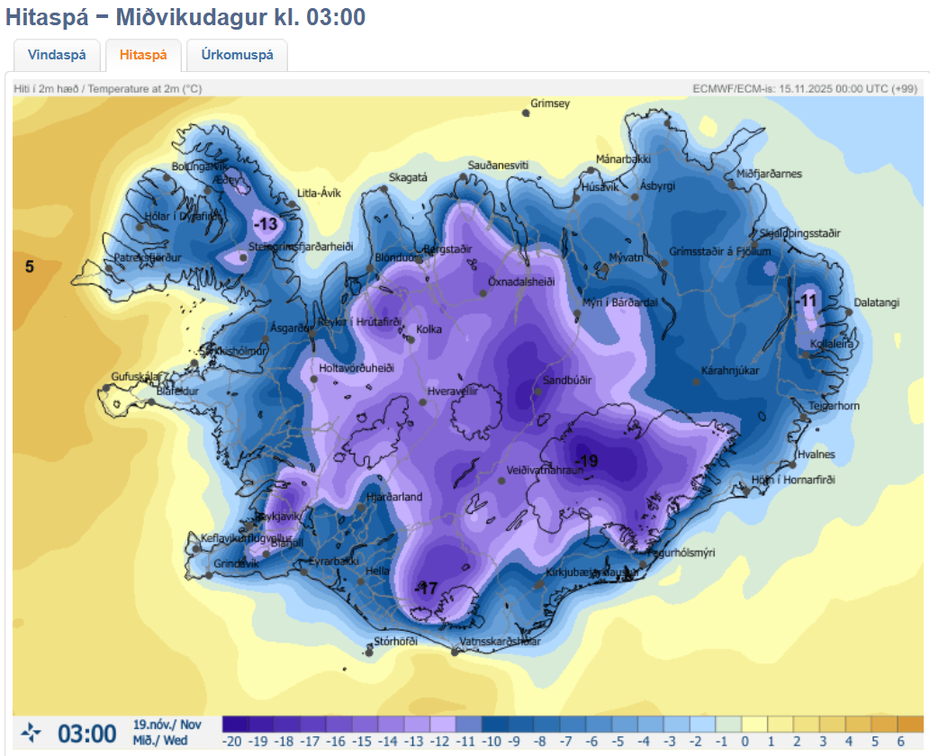 Í næstu viku er útlit fyrir svalar norðlægar áttir með éljum eða snjókomu víða. Kalt í veðri. Spá gerð: 15.11.2025 06:15. Gildir til: 16.11.2025 00:00.