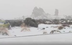 Fólk á Tenerife vaknaði við óvenjulegt vetrarlandslag: Stormurinn Emilia hefur valdið því að nú er eins og hálfs metra djúpur snjó í Teide-þjóðgarðinum, sem er mesta snjókoma sem mælst hefur á eyjunni síðan árið 2016.