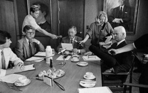 Goðsögnin Albert var leiðtogi reykvískra sjálfstæðismanna; „larger than life“ með bakið upp við vegg vegna Hafskipsmála. Albert ræddi ekki við fjölmiðla. Ég stillti mér upp í ráðuneytinu og sagði: “Albert á bak við þessar luktu dyr, neitar að tala við fréttastofu.“ Slíkt var óþekkt í Sjónvarpi.