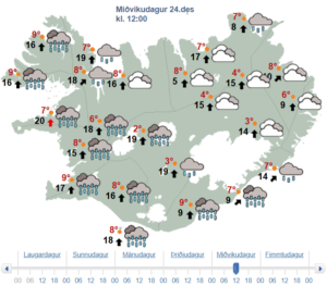 Vestan- og norðvestanátt og dálítil él, en snjókoma eða slydda um landið austanvert fram eftir degi. Hiti um eða undir frostmarki. Spá gerð: 20.12.2025 08:39. Gildir til: 27.12.2025 12:00.
