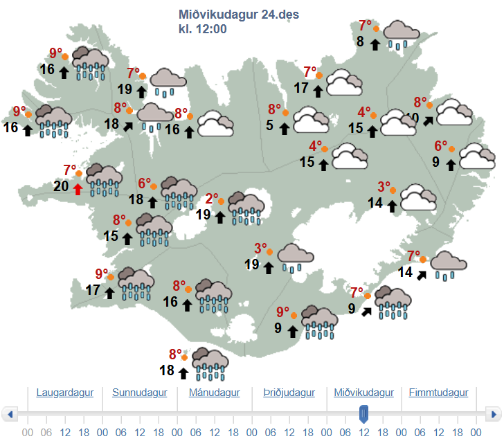 Suðvestlæg átt með rigningu eða slyddu og kólnar um tíma á Þorláksmessu, en síðan er útlit fyrir stífa sunnanátt með talsverðri rigningu á aðfangadag jóla, en úrkomuminna norðaustantil.