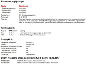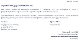 Rekstrar- og efnahagsyfirlit fyrir síðasta rekstrarárið 2023 hjá Skattstofunni, sýnir að eina eign félagsins voru aðeins 37.942 krónur. Málfríður Vilhelmsdóttir er jafnframt helsti eigandi að Heimahúsinu ehf. en Fasteignamarkaðurinn ehf. var skráður til húsa í Ármúla 8, skv. tilkynningu skiptastjóra í Lögbirtingablaðinu, hér að neðan.