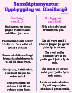 Orðin sem við notum í samskiptum skipta öllu máli í því hvort við eigum uppbyggileg samskipti, hvernig við vinnum saman og hvernig andrúmsloft við sköpum. Við viljum ekki ásaka, gagnrýna eða ráðast á hina manneskjuna með fullyrðingum.