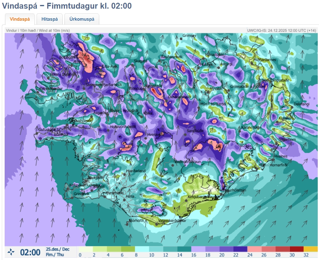 Spá gerð: 24.12.2025 08:14. Gildir til: 31.12.2025 12:00.