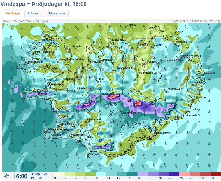 Á morgun er útlit fyrir minni vind en í dag, nema austanlands, þar blæs enn af svipuðum styrk og í dag. Áfram vætusamt og má búast við að vætan nái í alla landshluta á morgun. Á fimmtudag er ennþá spáð suðlægri átt, ýmist gola eða kaldi. Í norðausturfjórðungnum ætti að vera þurrt og bjart veður, en í öðrum landshlutum má búast við skúrum. Spá gerð: 30.09.2025 06:44. Gildir til: 01.10.2025 00:00.